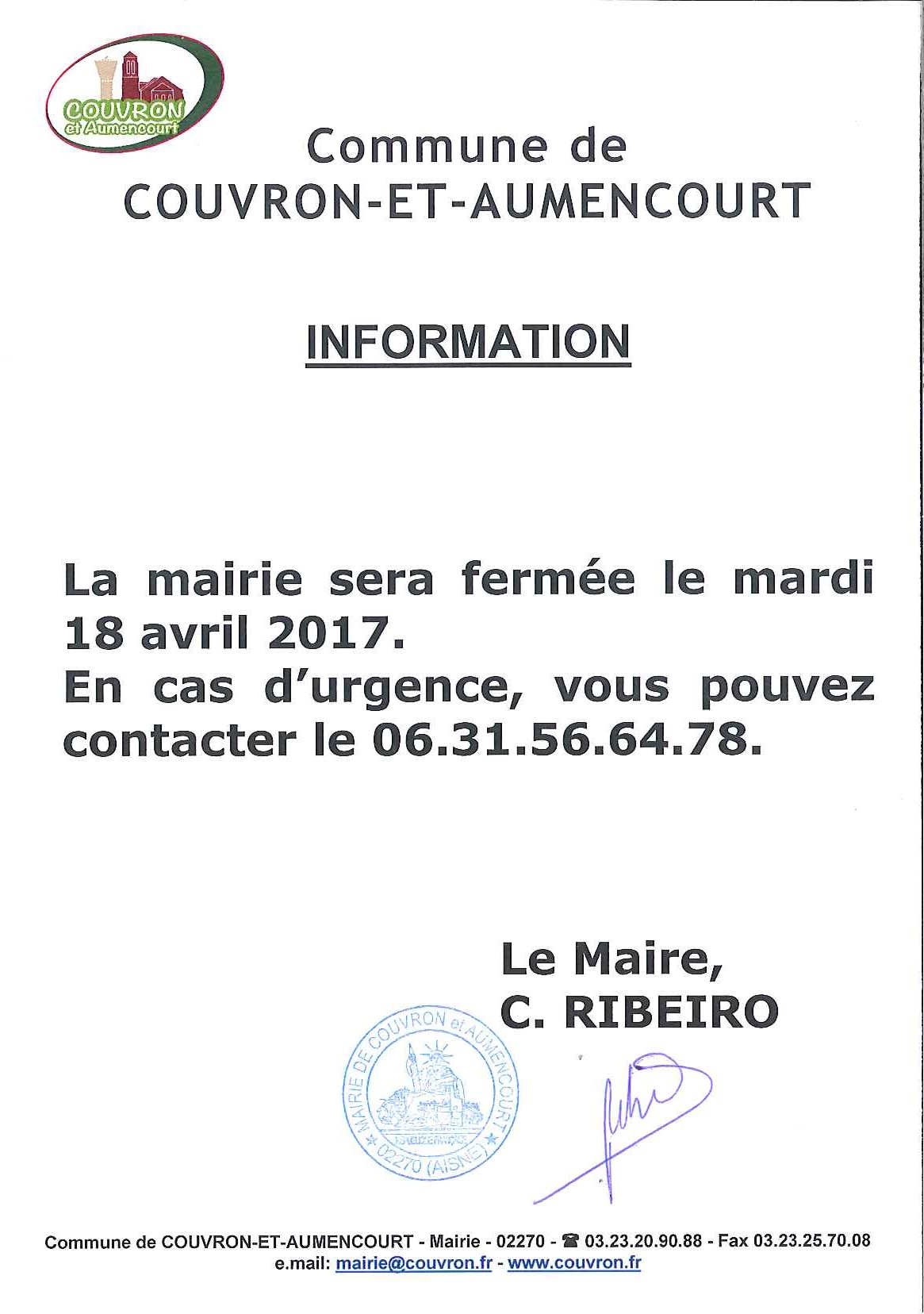 Affichette fermeture mairie 18 avril
